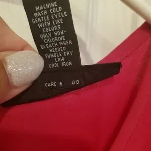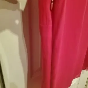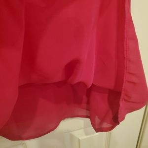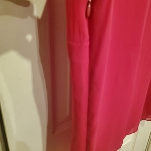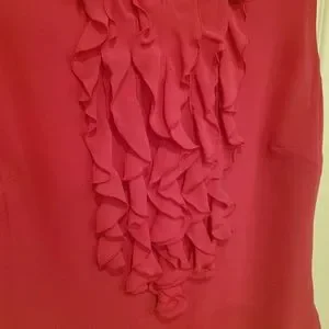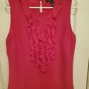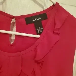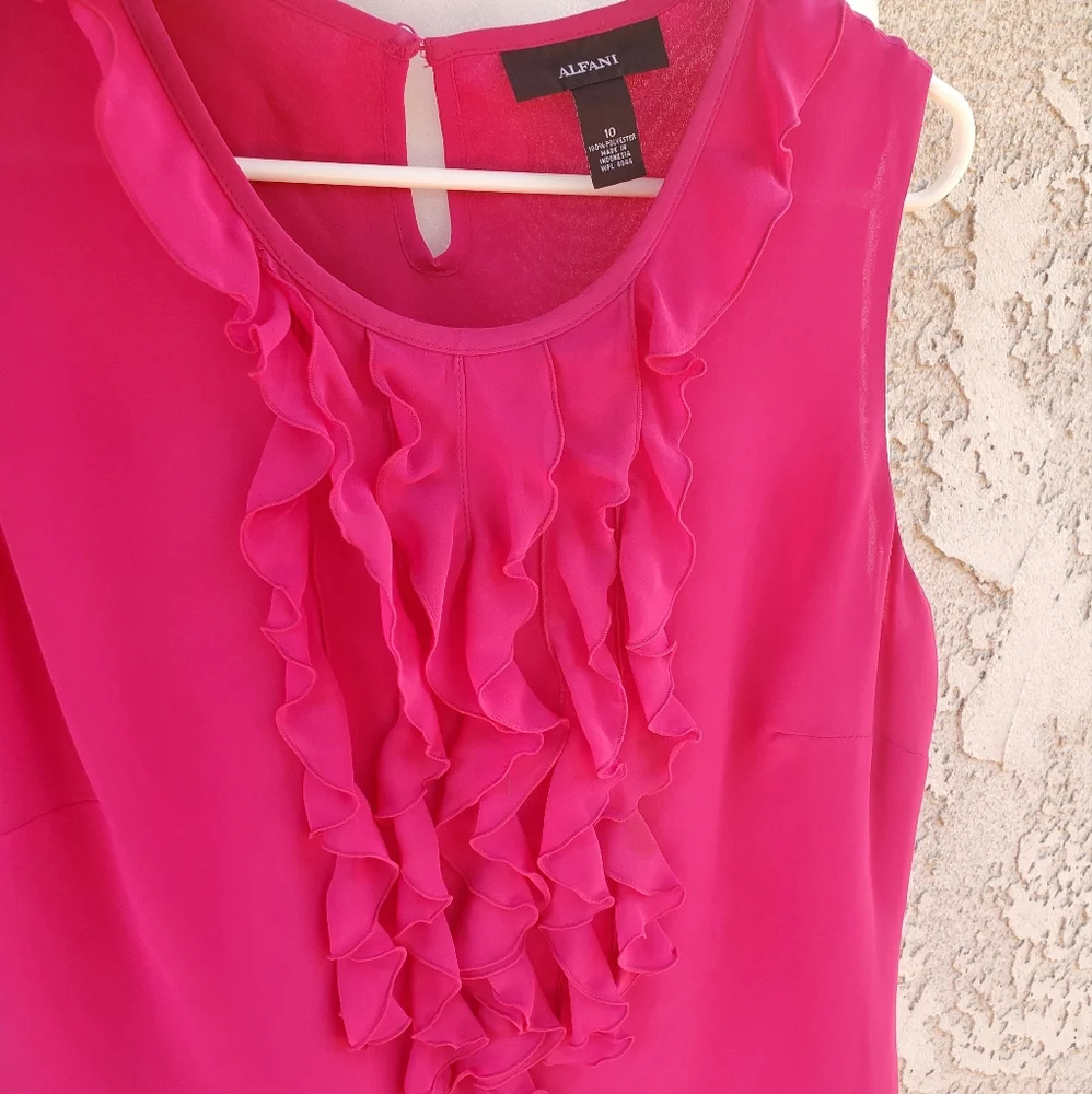 Cute fuchsia ruffle top from Alfani. Size 10 I measured Top to Bottom 27 inches and 19 3/4 armpit to armpit. It is lined. A couple of marks, one on the ruffle area and one tiny one in front that looks like a t.