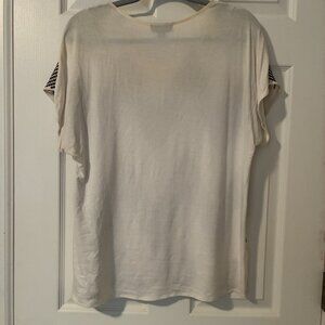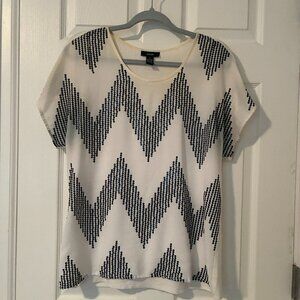 Black and White sequence shirt. Great for going out! Front panel is 100% Polyester, back panel is 95% Rayon, 5% Spandex. Neck trim is slightly yellowed and discounted for this reason. In great condition otherwise.