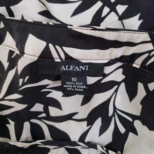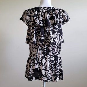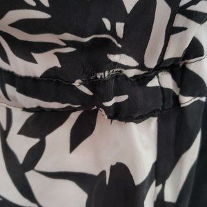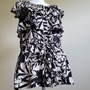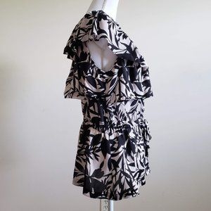 Features: button closure, sleeveless, scooped neckline, ruffled details, hidden waist belt, black and cream floral print.