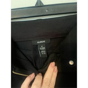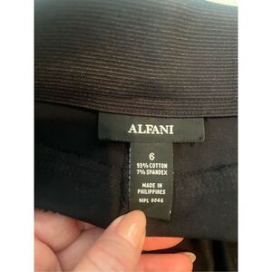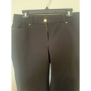 These pants are like a pair of black jeans but stretchy. They have gold button accents as shown in photos and pockets on the back. They are 93% cotton and 7% spandex. Waist band also stretches.