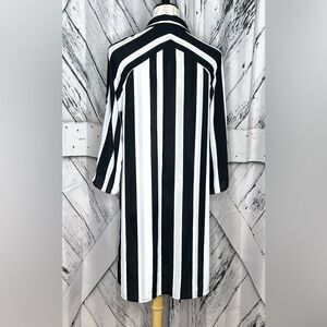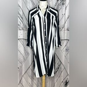 Black, white and gray striped button down tunic shirt.