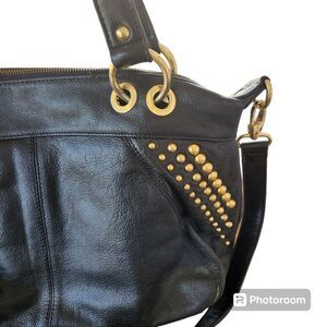 Brand: Alfani Size: Large Handbag Color: Black, gold Style: Convertible Crossbody/Shoulder Handbag in black leather with gold stud accents Condition: Preloved, excellent used condition, no rips, flaws or stains