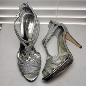 Condition: Pre-Owned - Good - Silver Open Toe Slip-On Zip Heels. Minor chip in heel.