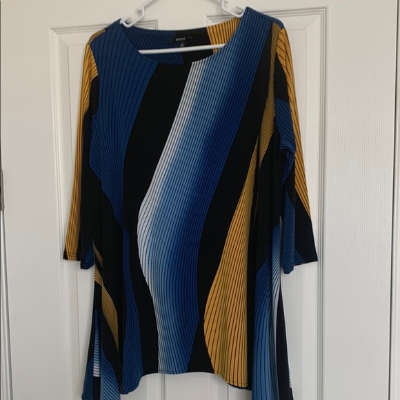 This Alfani tunic showcases a striking asymmetrical design. The relaxed fit and tunic length offer a comfortable yet stylish look, perfect for any casual outing. Its unique pattern and ribbed texture add a modern touch to your wardrobe. Excellent condition. No rips or stains. Size 1x. Armpit to armpit is approx 23 inches. Stretch to fabric. (See photos) colors as seen in photos