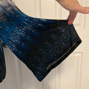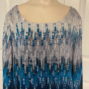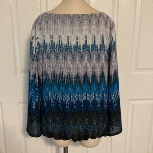 Alfani Wide Sleeve Blouse in size 16. Teal, gray and black pattern with small silver bar accents on the front top portion. Boat neck, fully lined body, sheer sleeves with elastic at the bottom for blouson bottom. 100% polyester. Excellent like new condition. Please see photos for approximate measurements laying flat and details. From smoke free and pet free home.