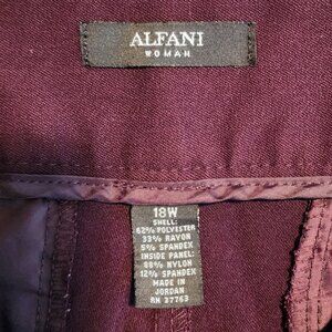 These are Alfani Woman wide leg work pant in size 18W with a Tummy Control panel in color Merlot. Hemmed for 5'-4" tall wearer. Material is 62% Polyester, 33% Rayon and 5% Spandex. From a Fragrance-free home.