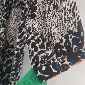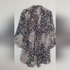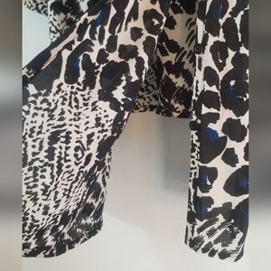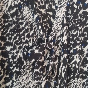 Alfani Woman Bold Blouse Sheer & Lightweight 3/4 Sleeves Button Up Plus Size 16W. V-Neck Tie. Completely Unbuttons. Rouched Chest and Back. Resembles Animal Print. Black, White & Blue. 100% Polyester. EUC.