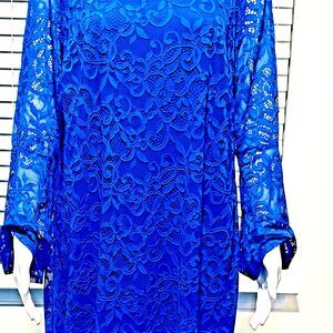 The Alfani Woman formal dress in size 18W is a stunning sheath style dress in a beautiful blue color. It features a round neckline, long sleeves, and a 16 inch zipper in the back of the dress for closure for easy wear. The dress is lined and made from a blend of nylon, spandex, and polyester, offering a relaxed fit that is perfect for all seasons. The dress is adorned with a lace-like overlay and has a knee-length hemline, creating a classic, timeless, and sophisticated look for formal occasions. With its stunning design and excellent condition, this dress is a perfect addition to any woman's wardrobe. This dress comes from a smoke-free home!