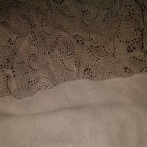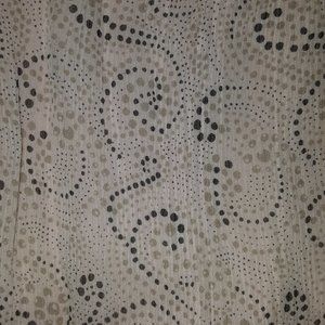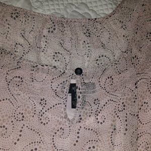 Alfani Woman Soft Pink Peplum Blouse & attached Camisole, size 24. Swirly dotted print sheer over-blouse = 100% silk, attached blush pink camisole = 100% polyester. Print is swirls of small dots in tan, brown & grey on blush pink background. Round keyhole neckline. Elastic waist with self-tie belt and soft peplum. Long sleeves elasticized at wrist. Very soft, romantic and lightweight. 20" armpit to armpit; 29" shoulder to hem. Smoke and pet free home.