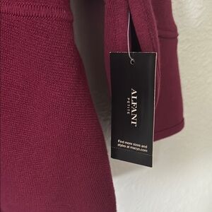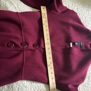 Chic deep red blazer with three-button closure. Tailored fit with unique sleeve detail. Ideal for work or formal events.
