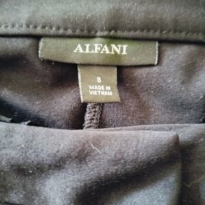 The product is a pair of Alfani women's dress pants in black, size 8 with a modified hem (hemmed 1.5 inches). These formal and dressy pants are made of polyester with a rayon fabric type, featuring a flat front design. With a waist size of 33 inches and an inseam of 28 inches.