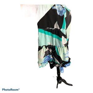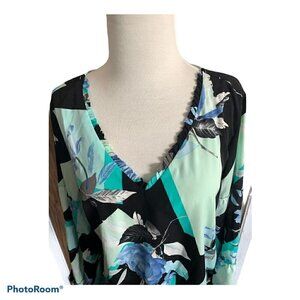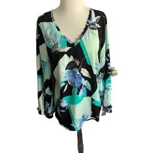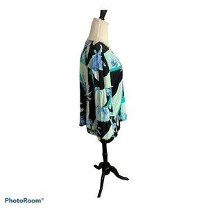 Alfani Womens Floral Long Sleeve Blouse Black Mint Teal Blue Medium