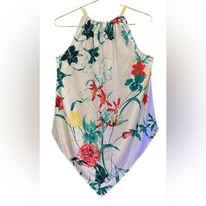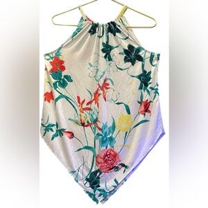Freshen up your wardrobe with this elegant floral blouse by Alfani. This sleeveless tunic top features a high neckline, pointed hem, and pullover style for a flattering, effortless fit. Its lightweight polyester-spandex blend provides gentle stretch and comfort, making it perfect for any occasion.