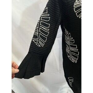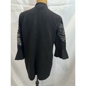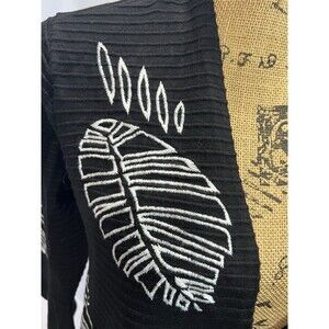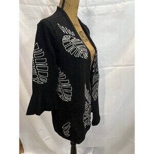 Open front black cardigan with white embroidered leaf print.