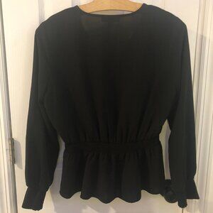 This is petite, so a bit shorter, but look is similar to model here: https://www.amazon.com/Alfani-Womens-Smocked-Peplum-Top/dp/B0C56PX3KM?th=1