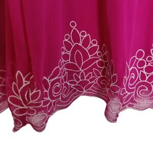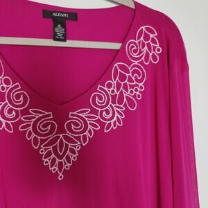 Alfani women's hot pink boho blouse. Stretchy mesh with detailed white embroidery along the collar, hem, and sleeves. Tiered flare sleeves. V neckline.