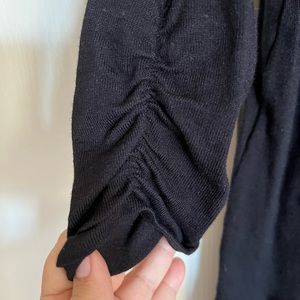 Alfani black round crew neck sweater tunic with ruched long sleeves, loose fit they body and gold zippered functioning pockets in front. Super versatile piece—perfect for a casual day with jeans and boots or a night out with leather leggings and heels.