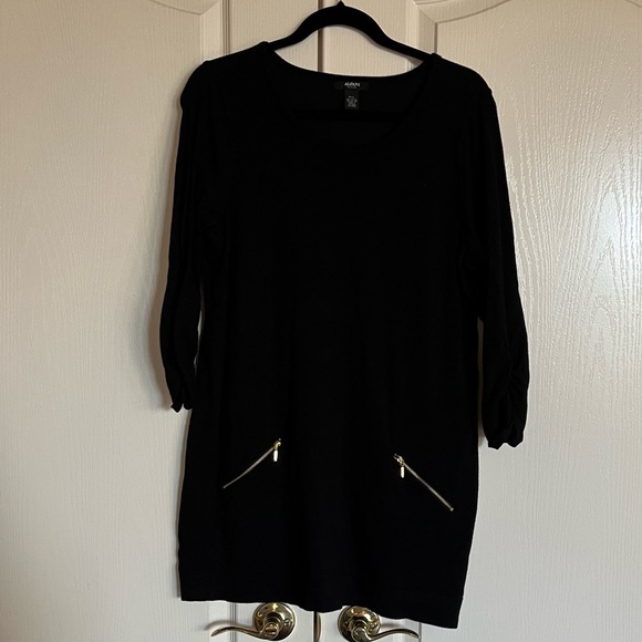 Alfani black round crew neck sweater tunic with ruched long sleeves, loose fit they body and gold zippered functioning pockets in front. Super versatile piece—perfect for a casual day with jeans and boots or a night out with leather leggings and heels.