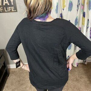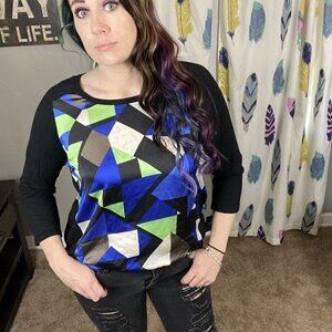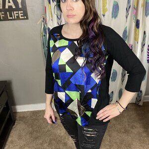 Alfani 3/4 sleeve top. Sleeves, trim and back are plain black knit material. Front is a silky lime green, bright blue, white and black geometric panel. Body: 65% rayon 35% nylon. Front panel: 100% polyester. Size medium.