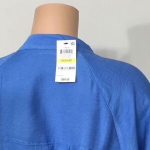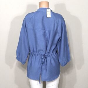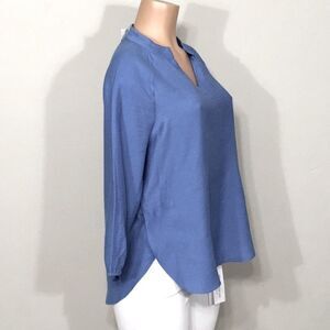 Beautiful blue 3/4 length top. Gathers in back at waist. Split hem. Elastic at cuff. This top is beautiful and really soft! It’s a slightly lighter blue. Hard to get it in the house lights:)