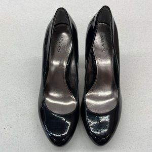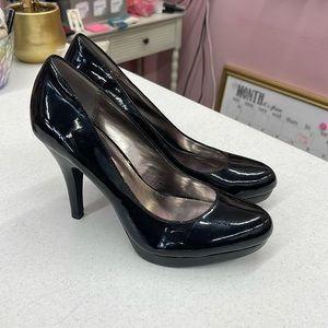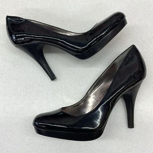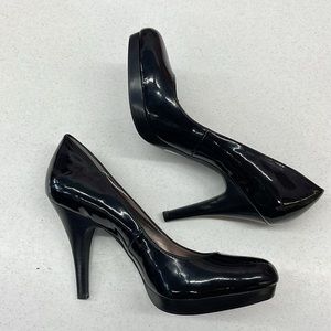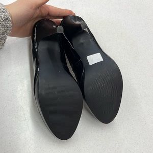 Alfani Maddy black shiny 4.5” heels with metallic lining, size 8M slight crack on left shoe otherwise in new condition never worn