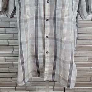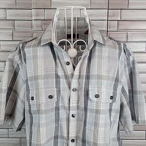 Cotton polyester blend grey plaid button down shirt by Alfani. Two flap chest pockets with button closures, a scalloped hemline and a tuck at the locker loop for some extra room in this slim fit design. Great pre-owned condition