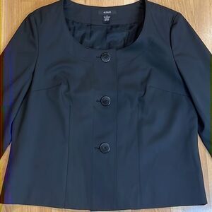 Great condition slightly stretchy scoop neck 3 button closure blazer/jacket. No pockets. Size 4 but measurements taken flat are approximately 19” across chest, 20.5” long, 24” long sleeves.