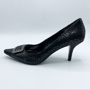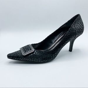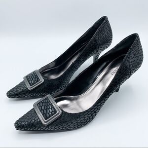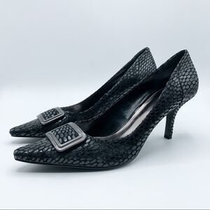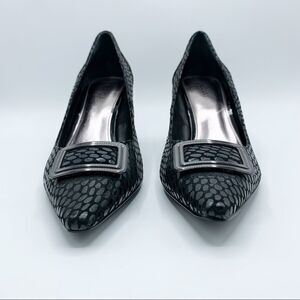 These NWOT Alfani pumps, feature a python-like textured pattern that transforms this pump from day to night. 3” leather wrapped heel on a man-made sole. Never worn, as shown. Pointed toe. Gunmetal buckle embellishment Please see photos for additional details. 3" heel, 0.2" platform.