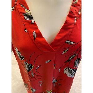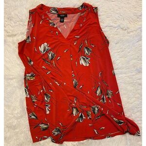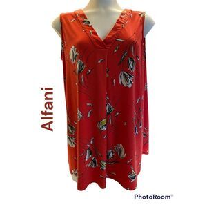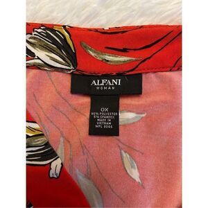 This is a woman’s very pretty Alfani SZ 0X blouse/top. It is V-neck, sleeveless and red with a stylish floral print. Very flowy and comfortable.