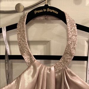 NWOT Alfred Angelo prom/cocktail halter dress. Shaped cups, beaded halter strap, zip back closure. Nude and silver.