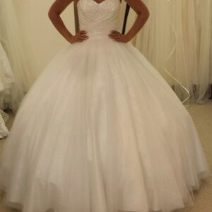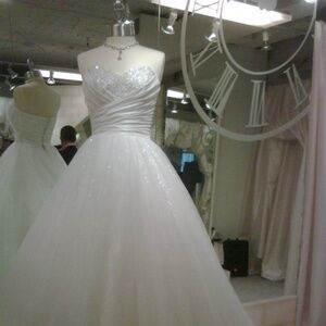 Alfred Angelo Disney Cinderella Style # 205 Fairytale Wedding Dress Diamond White Sz. 2 NWT. It's a gorgeous dress and it's ready for your wedding day. This dress is a beauty and has so much sparkle. If you want to see it in all its glory check out the TV show Four Weddings Season 5 Episode 5. The last bride to marry in that episode is wearing this Cinderella wedding dress. Her dress won in the wedding dress category as best wedding dress in that episode.