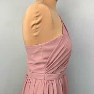 This elegant one-shoulder dress in a soft pink hue is perfect for any occasion. Its flowing design offers both comfort and style. Good preowned condition. One small spot on shoulder as seen in photos. See all pictures for details and measurements.