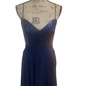 Elegant and timeless, this Alfred Angelo evening gown features a sparkly lace bodice with a flattering V-neckline and flowing chiffon skirt. The perfect dress for formal occasions, weddings, or evening events.