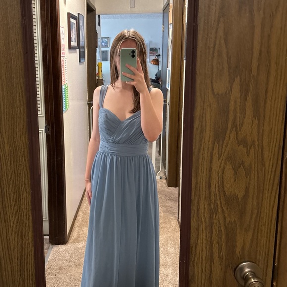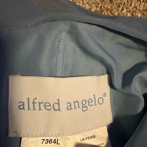 Chic light blue maxi dress by Alfred Angelo. Features elegant straps and a flowing silhouette. Ideal for special occasions.