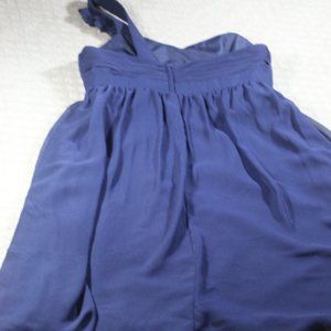 This formal mini dress features a ruched bust, single strap with fabric flowers, and flattering high waist. Flowy Navy blue chiffon material. Excellent pre-owned condition - like new.