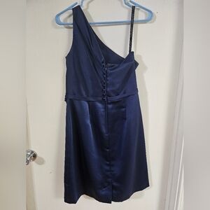 Chic Alfred Angelo navy blue dress with a sleek, one shoulder design.