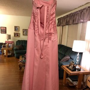 This was purchased brand new from Alfred Angelo before they went out of business. This is a strapless gown with a corset back and has two button panels so none of the back is exposed as you lace it up. I wore this once when I served as Maid of Honor at my best friend’s wedding and haven’t worn it since! The shade of the gown is Tea Rose. Great for a wedding, homecoming, or prom! No defects!