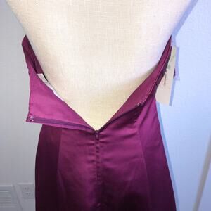 Strapless neckline in a solid berry color, which is a maroon or deep red. Pleated style gives a ruched effect. Calf or tea length. Zipper closure in the back. Extra material is included to make spaghetti straps.