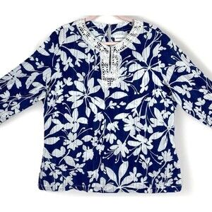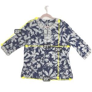 Alfred Dunner Tunic Top Womens SZ 14P Blue White Embroidered Collar Boho Chic Beach wear Casual streetwear