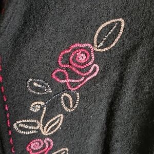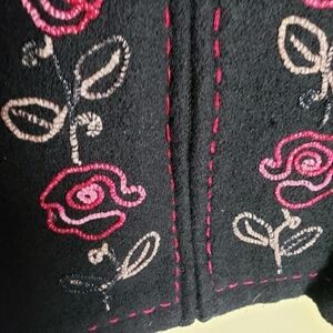 Gorgeous 100% Wool Zipper Front Sweater/Jacket. With beautiful floral stitching down the front and on the sleeves. Coordinating red running stitch around the edges.
