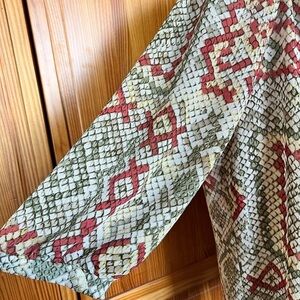The blouse boasts a super fun and trendy abstract geometric print, which also incorporates a subtle hint of snake print, making it a chic and unique addition to your wardrobe.