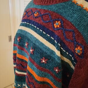 vintage alfred dunner sweater, womens 1x plus size sweater, red striped sweater, embroidered floral sweater, cottagecore grandma sweater, cozy acrylic sweater, retro knitwear, 90s style pullover, fall fashion top, classic crew neck sweater, oversized fit sweater, layering piece, cottage chic embroidery, granny core fashion, soft knit pullover, autumn outfit, boho vintage sweater, statement floral top, relaxed fit sweater, unique striped knit, y2k style, floral accent sweater