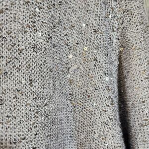 Sequin embellishment with glamorous sparkle, open front design for effortless layering, silver metallic tone in versatile neutral shimmer, comfortable cardigan silhouette with relaxed drape, long sleeves for elegant coverage, party-ready glamour perfect for celebrations.