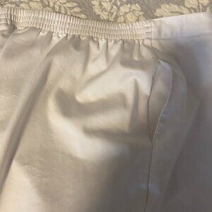 Wash and wear white pull-on slacks with side pockets are 58%cotton, 40% polyester, and 2% spandex. The front has a fabric waistband and the back waistband has elastic. Machine wash cold. Great condition.