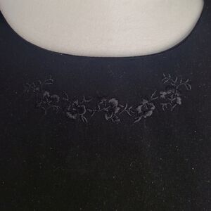 Short sleeve blouse with embroidery around the front of the shirt (see pic). Silky material is really soft, too. Back has 3 button closure, no rips tears or stains.