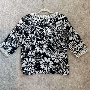 Chic blouse with bold black and white pattern. Elegant design by Alfred Dunner. 3/4 sleeves and v-neck with white crochet accents. Dress up or down. Comes from a smoke/pet free home. No flaws.