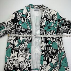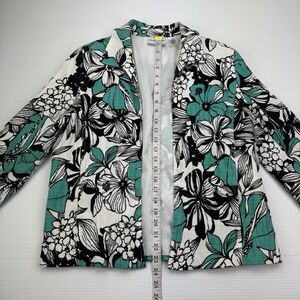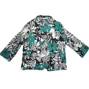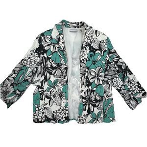 This Alfred Dunner blazer is a stylish and classic addition to any women's wardrobe. Made from a comfortable cotton blend outer shell and lined with polyester, this blazer features a floral pattern in black, turquoise, and white colors.