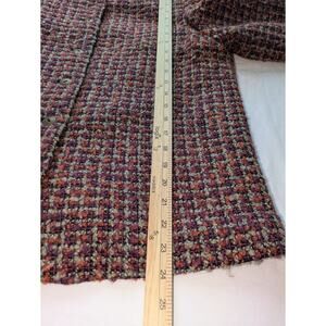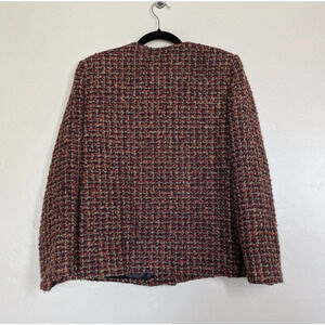 multicolor tweed jacket, button front blazer, collarless style, structured silhouette, vintage-inspired look, career wear, business casual, textured woven fabric, timeless wardrobe staple, professional layering piece, chic office attire, fall/winter fashion, classic brand design