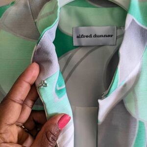 Elevate your layering game with this Alfred Dunner Women’s Blazer, Size 10, NWT. Featuring a chic green, gray & white abstract print, this swing-style jacket offers effortless drape and structure for a polished yet comfortable look.