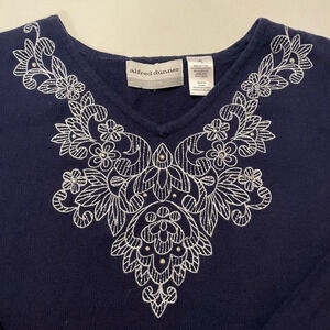 Dark blue 3/4 sleeve sweater with an embroidered and rhinestone accented v-neck and a fringe hem has been gently worn and is in good used condition.